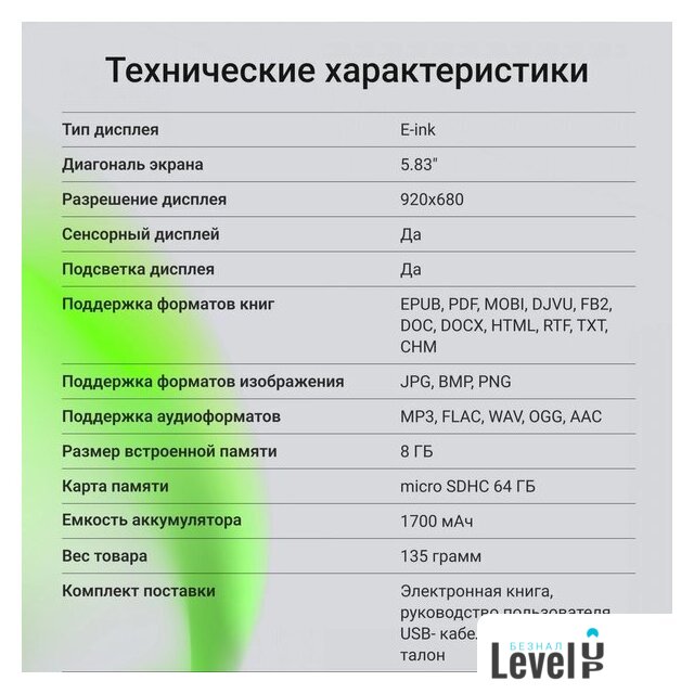 | Поддержка текстовых форматов | AZW3, DjVu, DOC, DOCX, CHM, ePub, FB2, MOBI, PDF, PRC, TXT |