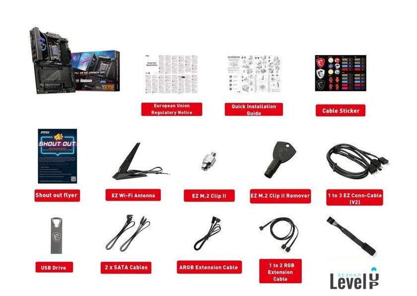 | Комплектация | Board• 1x MotherboardDocumentation• 1x Quick installation guide• 1x European Union Regulatory NoticesApplication• 1x USB driveCables• 2x SATA 6Gb/s cables• 1x 1 to 2 RGB extension cable• 1x ARGB extension cable• 1x 1 to 3 EZ Conn-Cable (V2)• 1x EZ Front panel cableAccessories• 1x EZ Wi-Fi Antenna• 1x Cable sticker• 1x EZ M.2 Clip II• 1x EZ M.2 Clip II Remover |