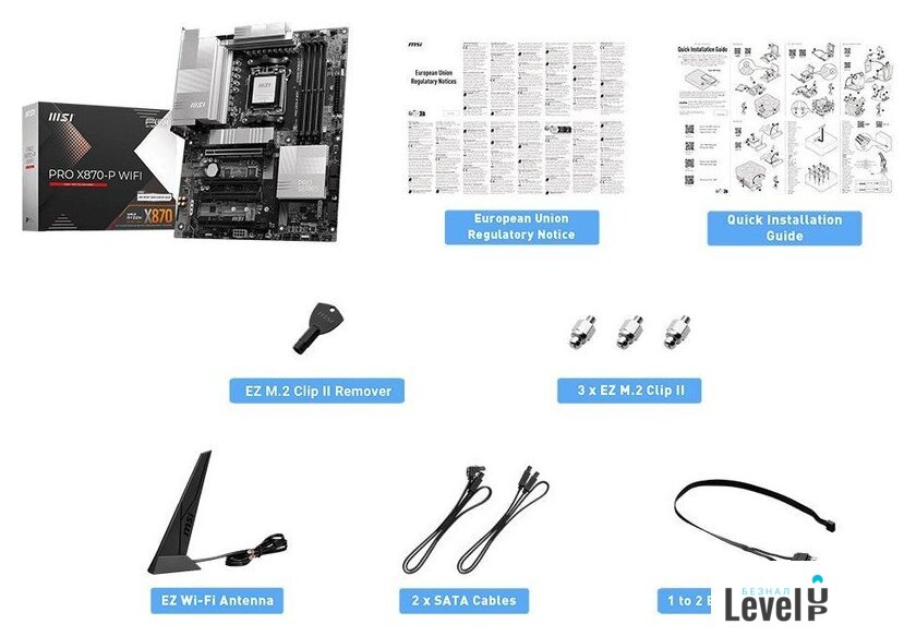 | Комплектация | Board• 1x MotherboardDocumentation• 1x Quick installation guide• 1x European Union Regulatory NoticesCables• 2x SATA 6Gb/s cables• 1x 1 to 2 EZ Conn-Cable (V1)Accessories• 1x EZ Wi-Fi antenna• 3x EZ M.2 Clip II• 1x EZ M.2 Clip II Remover |