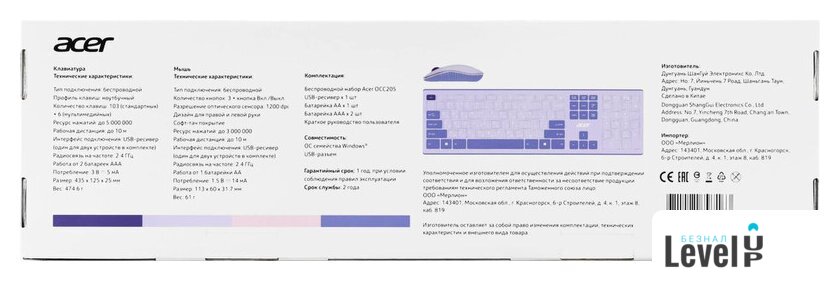 Полная комплектация набора | - беспроводная мышь- беспроводная клавиатура- USB-приемник- документация |
