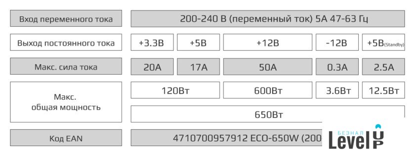 | Комбинированная нагрузка по +12V | 600 Вт |