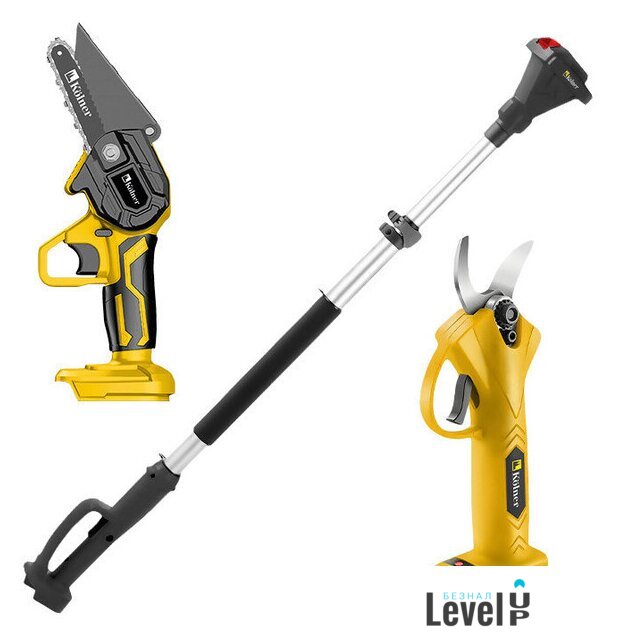 Комплектация | - Секатор аккумуляторный.- Пила цепная аккумуляторная.- Шина.- Цепь.- Телескопическая штанга.- Плечевой ремень.- Набор инструментов.- Аккумуляторы 2 шт.- Стационарное зарядное устройство. |