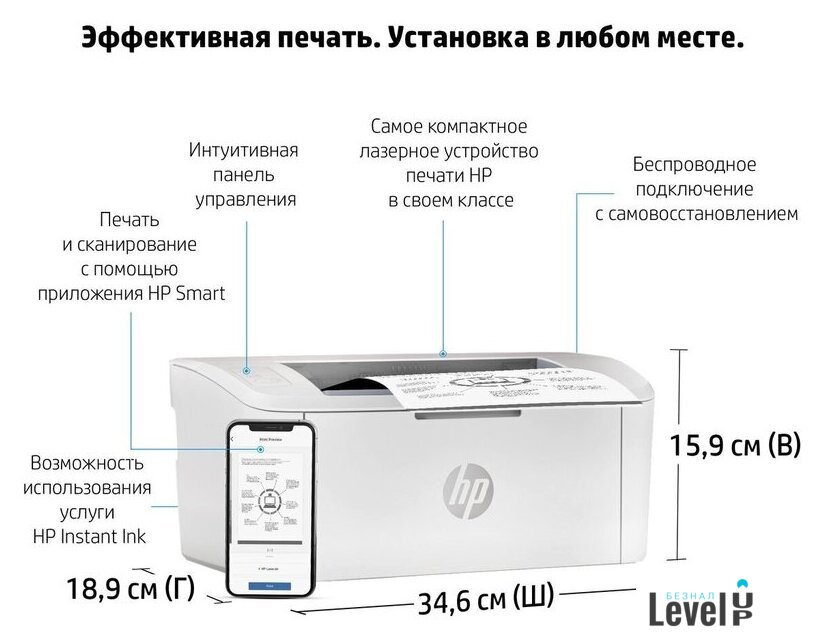 Комплектация | Принтер HP LaserJet M111w; кабель питания; картридж HP LaserJet с черным тонером (ресурс: 500 страниц); плакат с инструкциями по настройке; справочное руководство; руководство по гарантии; рекламная листовка |