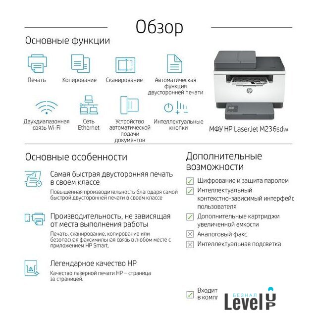 Комплектация | МФУ HP LaserJet M236sdwлазерный картридж HP Black LaserJet Toner Cartridge (ресурс 700 страниц)справочное руководствоплакат с инструкциями по настройкеруководство по гарантии и листовка с условиями гарантии (для некоторых стран)кабель питания |