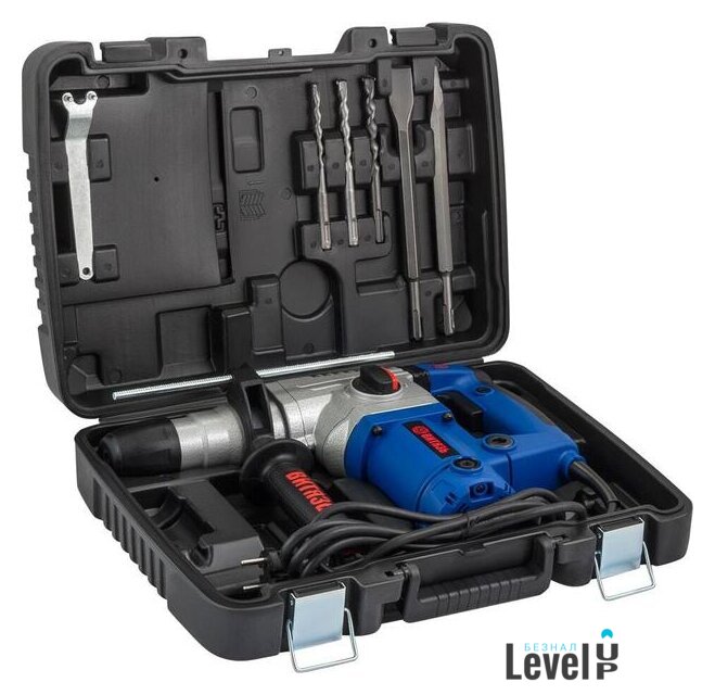 Комплект поставки | - дополнительная рукоятка- ограничитель глубины сверления- 3 сверла- 2 зубила- документацияПоставляется в пластиковом кейсе |
