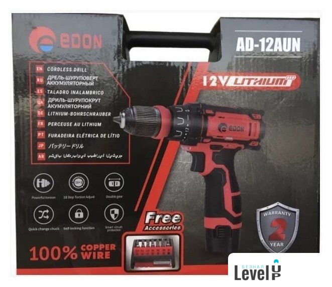 | Комплектация | - Дрель-шуруповерт EDON - 12в;- Аккумулятор Li-ion - 2 шт;- Зарядное устройство; - Кейс;- Инструкция на русском языке. |