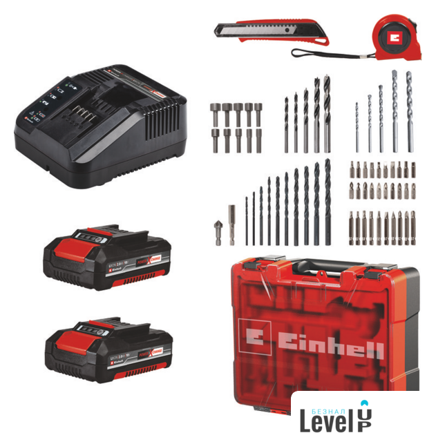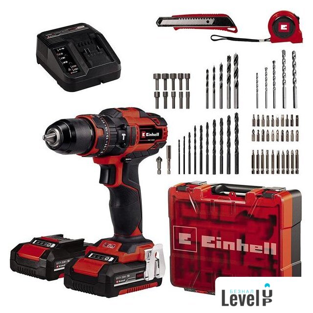 | Комплектация | - Аккумуляторная дрель- 2 аккумулятора 18В- Зарядное устройство- Набор оснастки из 64 предметов- Инструкция- Кейс |
