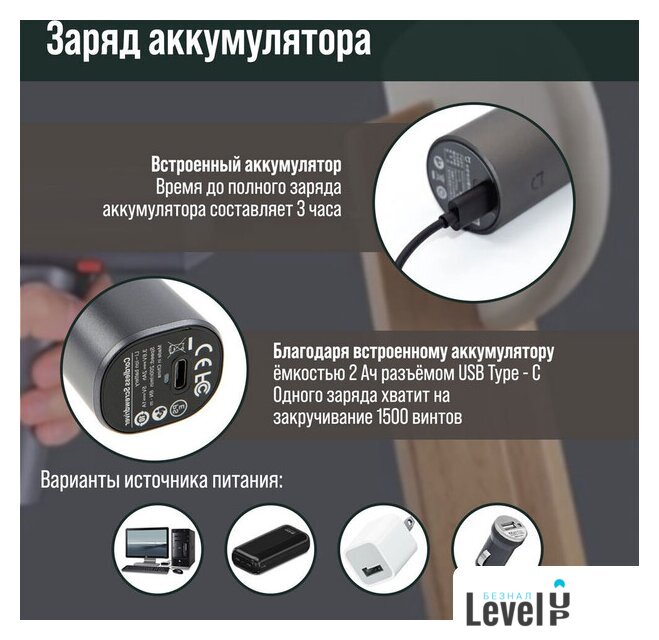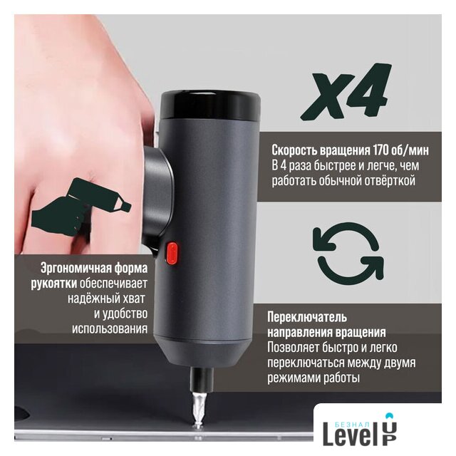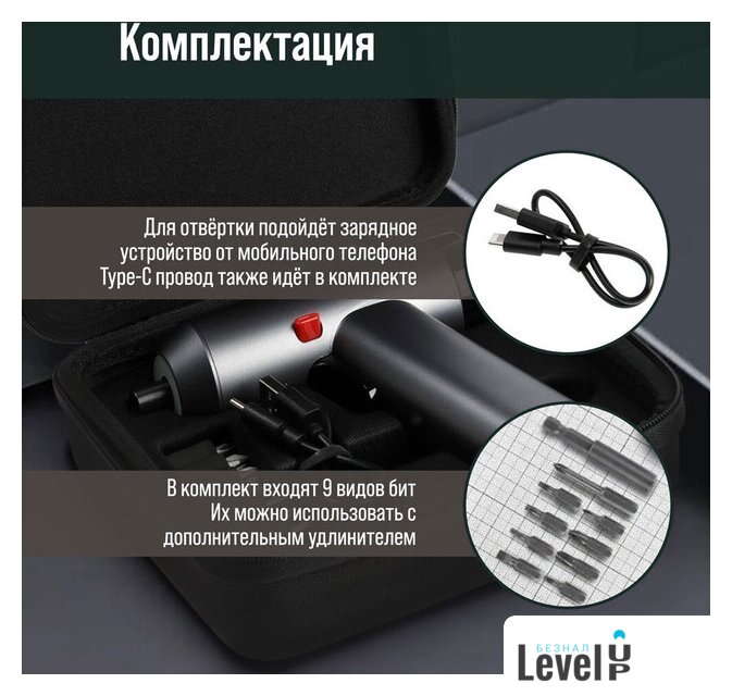 | Комплектация | кабель (USB Type-C), набор бит (9 шт.), чехол |