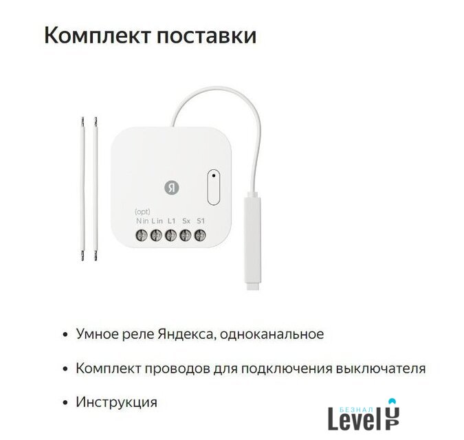 | Комплектация | Умное реле Яндекса, одноканальноеКомплект проводов для подключения выключателяИнструкция |