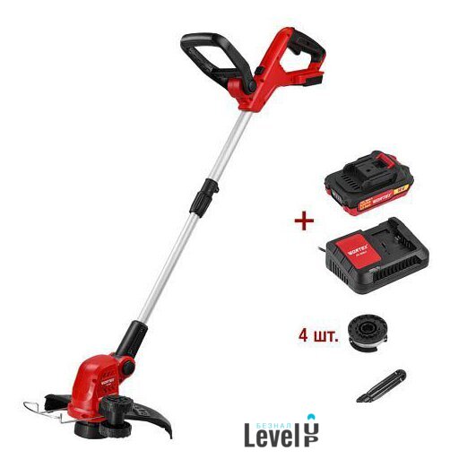 Аксессуары | - Аккумуляторная батарея - 1 шт.- Зарядное устройство - 1 шт.- Дополнительная рукоятка- Катушка под леску (установлена)- Катушка с леской - 4 шт.- Защитный кожух- Кромочное колесо- Предохранитель- Винт- Отвертка- Паспорт- Упаковка |
