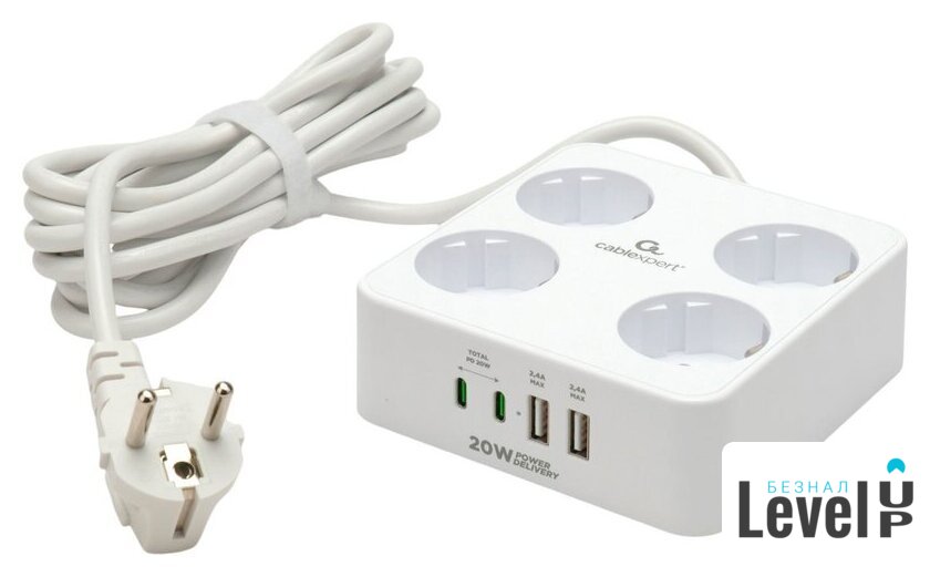 сетевой фильтр, кабель 3 м, 4 розетки Schuko (евро с заземлением) / 2500 Вт/USB
