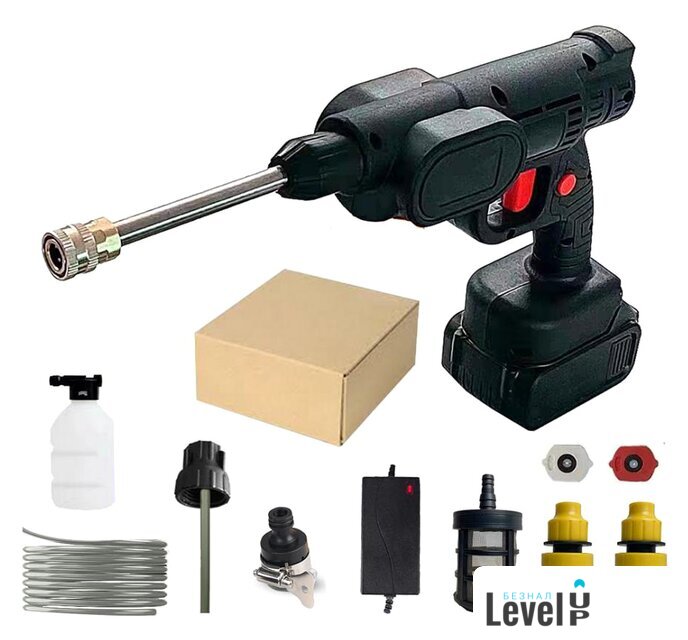 Комплектация | Пистолет - 1 шт.Аккумулятор Li-Ion - 1 шт.Металлическая штанга - 1 шт.Шланг - 1 шт.Коннектор для шланга - 1шт.Штуцер для садового полива - 1шт.Фильтр для шланга - 1 шт .Зарядное устройство - 1 шт.Насадка-распылитель - 2 шт.Емкость для моющего средства - 1 шт.Быстроразъемный соединитель - 2 шт.Руководство по эксплуатации - 1 шт.Коробка |